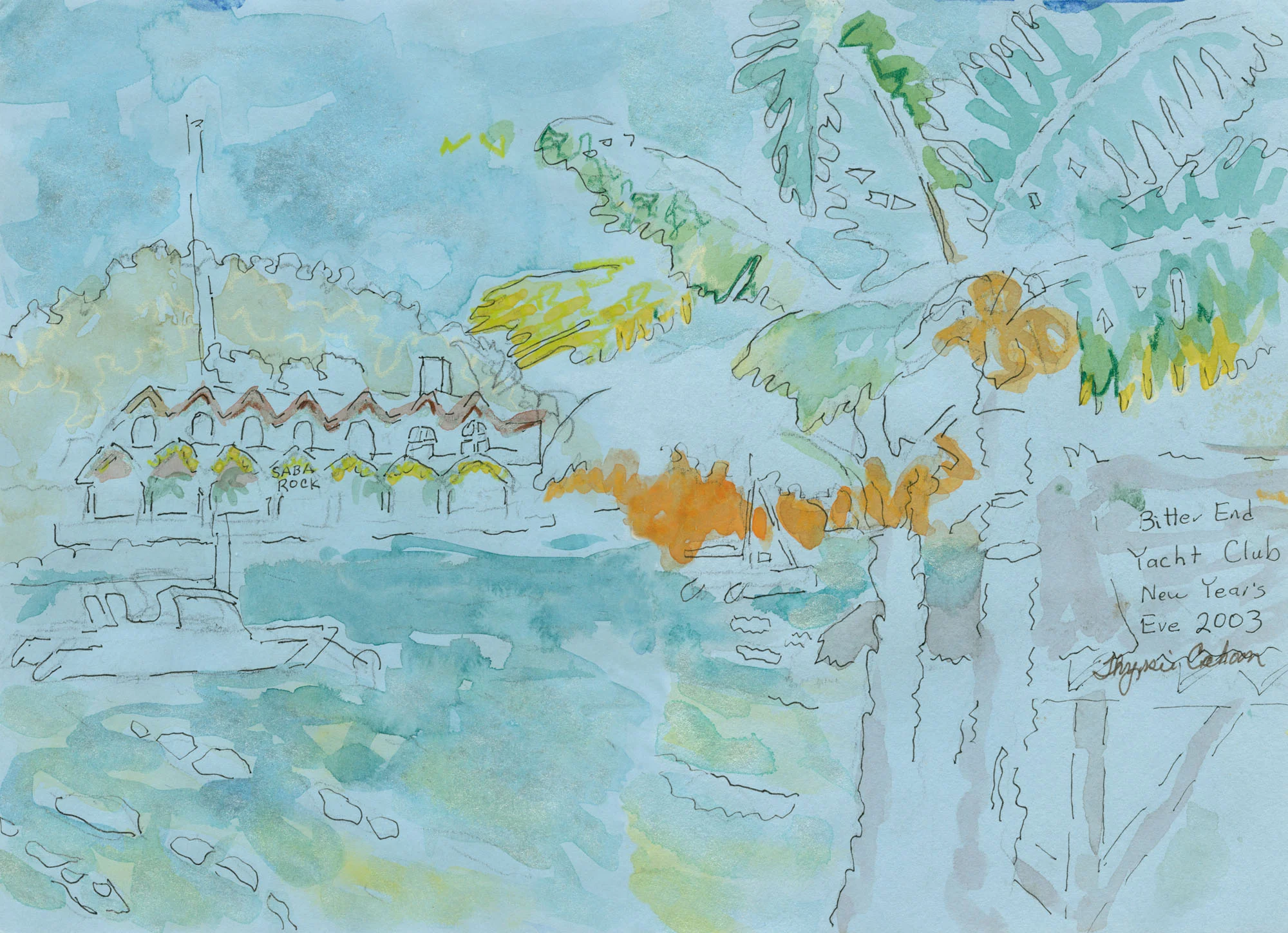 Artist’s Impressions: Well protected waters for a New Year’s anchorage. Resorts abound, here is a sketch from the Bitter End Resort, looking over to the Saba Rock Resort and Restaurant. Turquoise waters, small boat sailing, windsurfers, days sails, kiteboarding. We just missed Denzel Washington as he came in from his yacht for supplies. It’s a dream place I would like to return to.